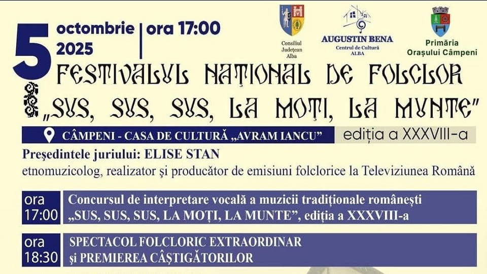 Casa de Cultură „Avram Iancu” din Câmpeni va găzdui duminică, 5 octombrie 2025, de la ora 17:00, a XXXVIII-a ediție a Festivalului Național de Folclor „Sus, sus, sus, la moți la munte”.